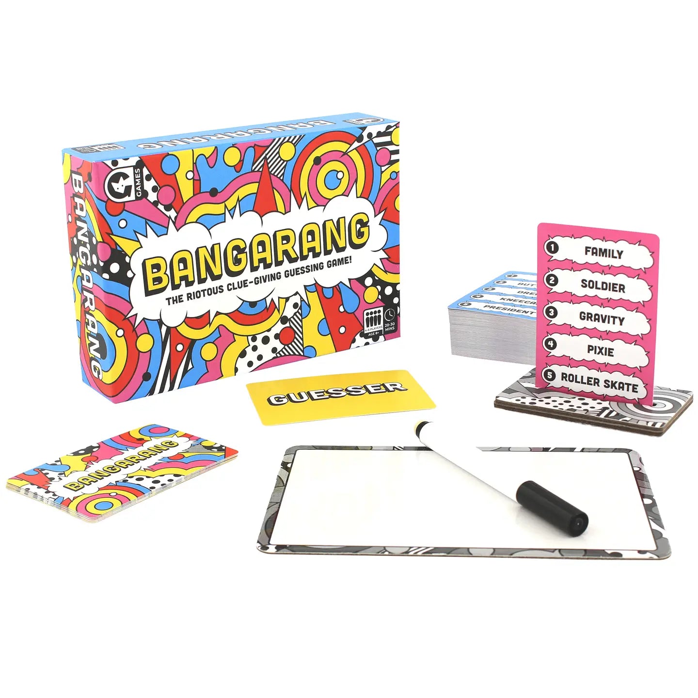 BANGARANG is a game of cooperative chaos - everyone works together as a team to score as many points as possible by guessing words based on the clues given. Guessers have 60 seconds to guess the words on the card with the help of a clamour of clues given by all the other players. The clues may be a single word, mimed, drawn, a sound or spelled out using the body - AND they will all be given at the same time, so brace yourself for things to get loud and ludicrous.