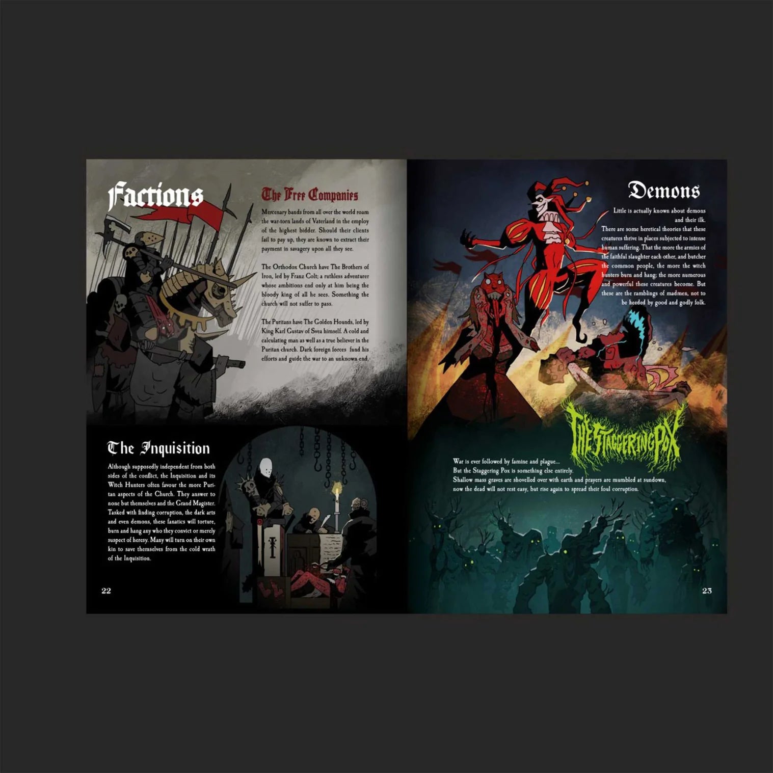 Embark on a dark and daring adventure where death and destruction lurks around every corner. The gunpowder and witchcraft infused game is a complete stand-alone RPG based on and compatible with the multi-award-winning apocalyptic heavy metal RPG MÖRK BORG. This action packed, rules light, art heavy OSR game offers swashbuckling adventure and gothic folk horror in an unholy blend.