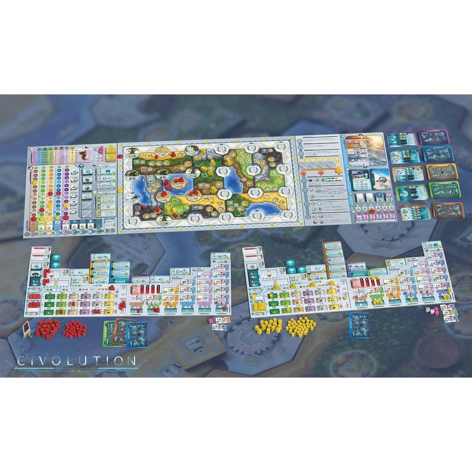 Civolution is a medium heavy to heavy euro-style game that utilizes a dice selection mechanism to trigger actions on a tech tree-like structure. As you figure out how to best use your dice and put your unique cards into play, tons of strategies and paths to victory emerge, though each time you play, you will only explore a fraction of the possibilities that the game’s system and many cards provide.