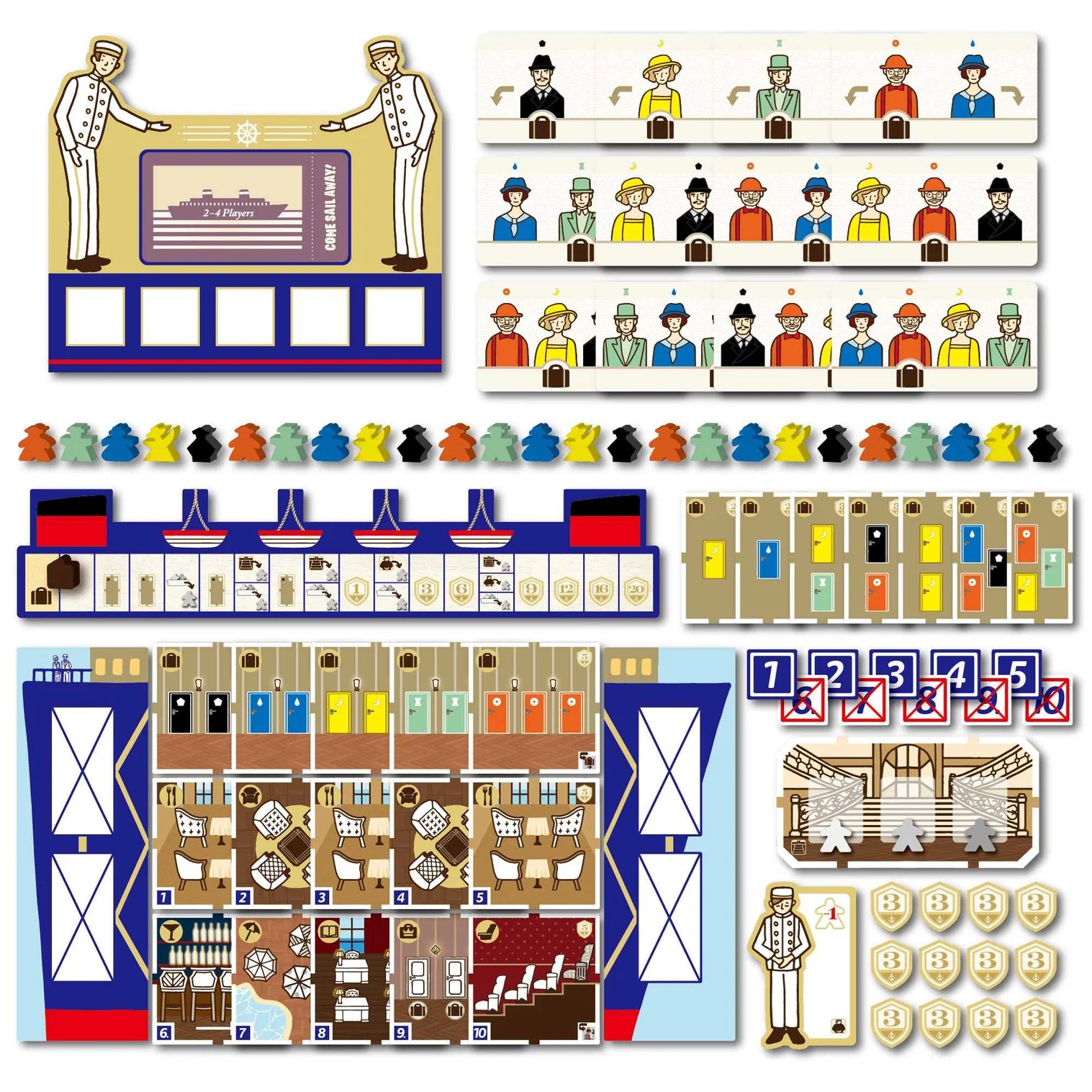 The aim of Come Sail Away is to guide passengers into your cruise ship as smoothly as possible, earning points in the process. In addition to earning points for filling each room on the ship, there are also bonus points for filling certain rooms faster than other players. Also, by guiding passengers with luggage to their cabins, you can advance on the luggage track, allowing you to place additional small cabins, gain additional passengers, and earn bonus points. As the game progresses, it is also important to think ahead and make sure you have room for passengers, otherwise you will have a crowd of disgruntled Passengers at hand!