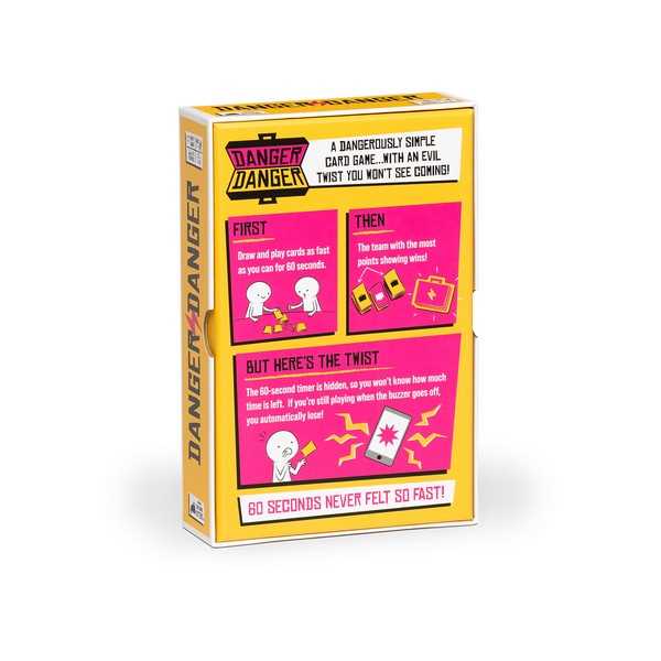 All the adrenaline of a high-stakes heist packed into a card game the whole family can enjoy. Danger Danger is a game where your team’s goal is to have the most Cases showing at the end of the round. You do this by drawing and placing cards, while the other team tries to thwart you. In order to win, you have to finish playing by the time a 60-second timer runs out. Oh, and you can’t see the timer at all! That means it’s just you, your teammates, and your combined instincts racing against an invisible clock and the other players.