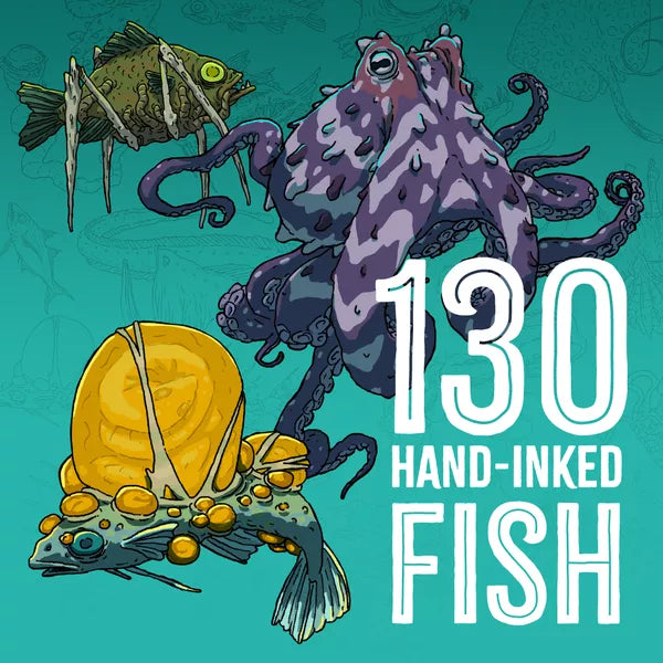 In the solo mode (which you can also co-op), you'll act as an ichthyologist on a mission to catch and catalog every fish in the sea. Over a campaign of dozens of games, you'll try to reel in every last fish and document their attributes on provided catalog sheet. At the end of each game, you'll have to discard an equal value of fish to the regrets you've collected and may have to let some fish go to return to another day. At the end of the campaign, you'll have a catalog of all fish names, depths, values and difficulties that can be used by players in the multiplayer game to help identify what they might fish up!