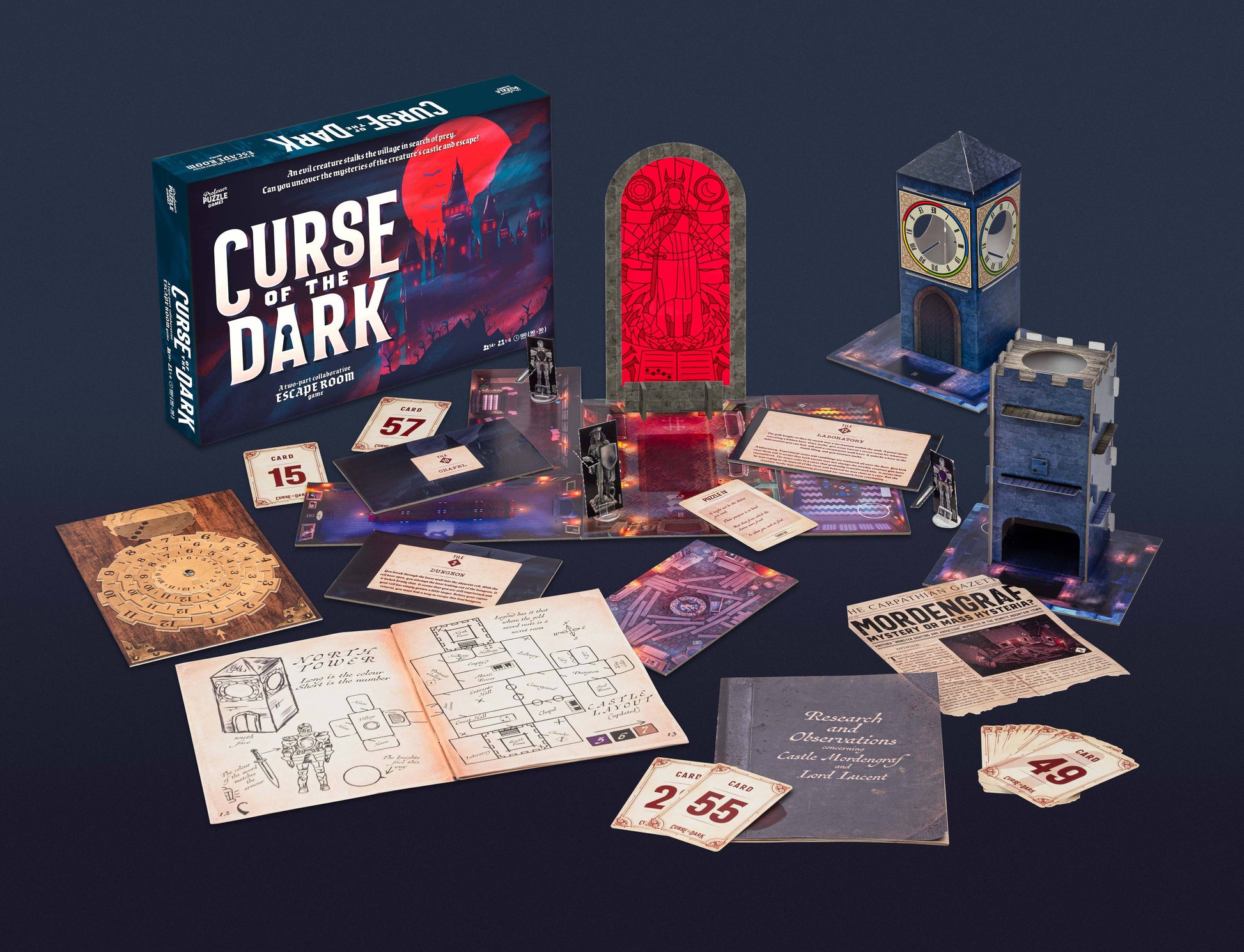 In Curse of the Dark, players build an interactive tiled map of the castle’s floor plan, discovering and solving over 20 interlinked puzzles. The game features innovative puzzle components and gameplay, and is designed to recreate the escape room experience at home.