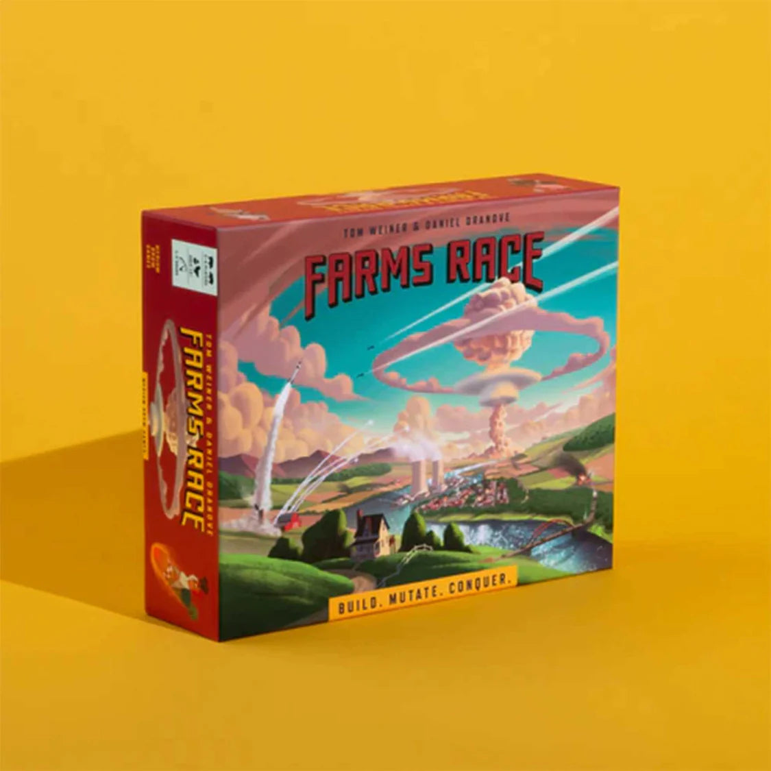 Radioactive waste from local power plants has granted you and your fellow farm animals both sentience and an insatiable hunger... for power. Now you must take up the weapons of your former masters, the humans, to fight both them and each other for control of the countryside.Farms Race is a 1-2 hour strategy game that parodies Eurogames like Catan and Agricola. Players play as the Supreme Leader of a species of farm animal racing to accumulate 10 Victory Points by building Barns and Armories, recruiting Spies, building the most nukes, and conquering opponents' regions with their herds.