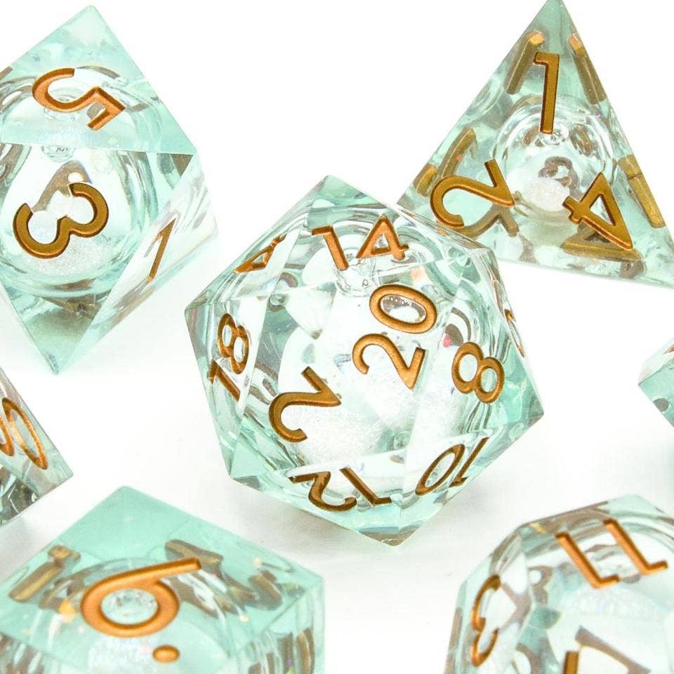 Dive into your Dungeons and Dragons campaigns with the Liquid Core Sharp Edged 7 Piece Set, a collection of dice that offers both precision and magical aesthetics. Each die is crafted with sharp edges for accurate rolling and contains a liquid core filled with sparkling mica, creating a stunning visual effect that enhances the gaming experience. Available in a variety of styles and colours, these dice are designed to complement any DnD adventurer's toolkit, adding a touch of enchantment to each roll.