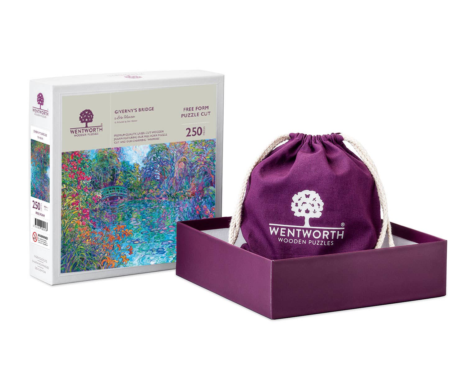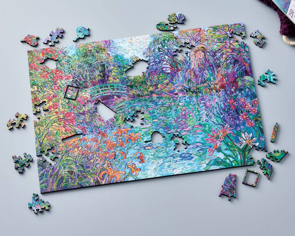 Available in 6 sizes. Giverny's Bridge by Erin Hanson is a beautifully detailed artwork that draws inspiration from the famous artist Claude Monet and his iconic gardens in Giverny, France. Now, transformed into a traditional wooden puzzle for adults, it is a fantastic gift for art puzzle lovers.