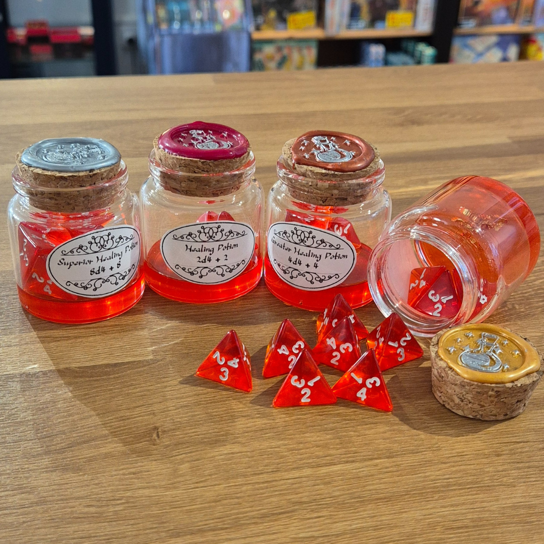 Four doses of greater healing magic for your D&D characters. Potion bottles range from 2d4 to 10d4, giving you a total of 24 dice across the 4 bottles.