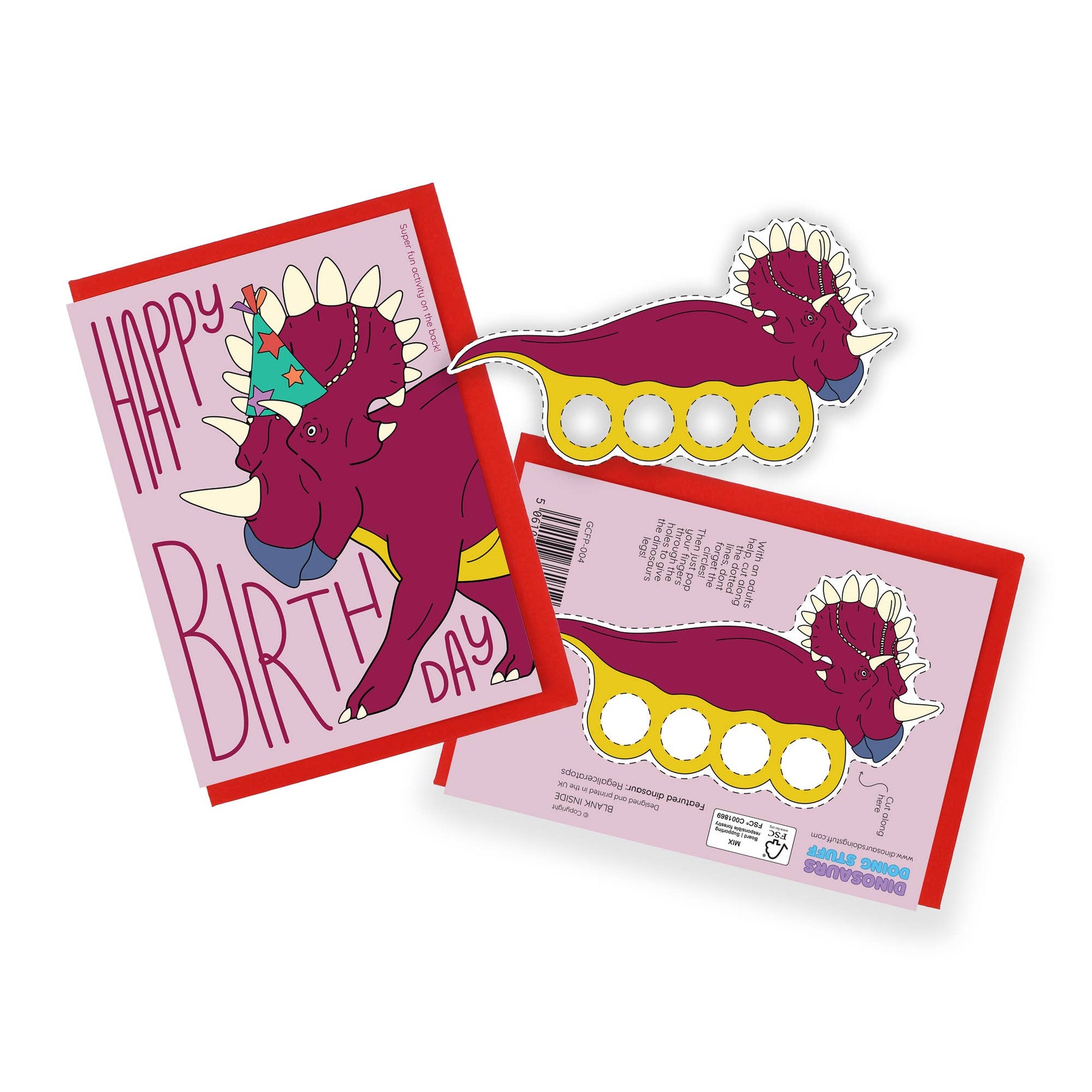 This card features a dark red and yellow Regaliceratops wearing a party hat. The text around it says 'HAPPY BIRTHDAY'