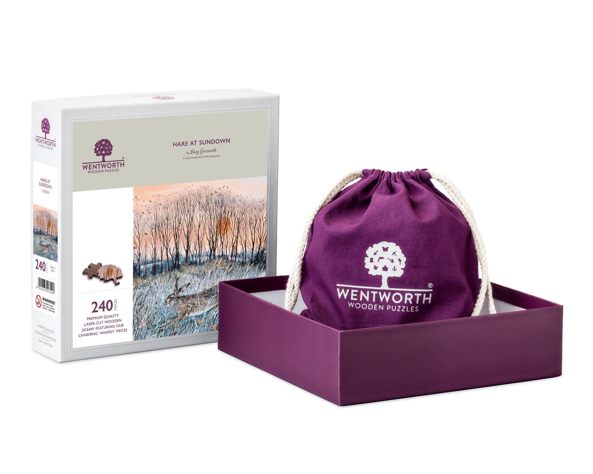 Premium Wooden jigsaw puzzle, in a plum drawstring cloth bag, placed into a plum and grey Wentworth branded box. This superb sunset scene with a hare will make a great gift for animal lovers and a unique jigsaw puzzle to enjoy during the winter. Complete with wonderful wildlife whimsies and irregularly shaped puzzle pieces that make completing this traditional wooden jigsaw puzzle a little trickier than you may think. Our talented designers love to challenge puzzlers with unusually shaped puzzle pieces and unexpected puzzle cut designs.