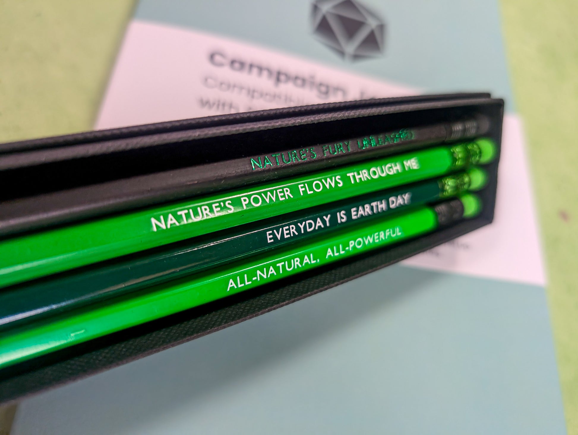 Accessorize your next D&D campaign with this set of 4 graphite pencils from Mystery Dice Goblin.