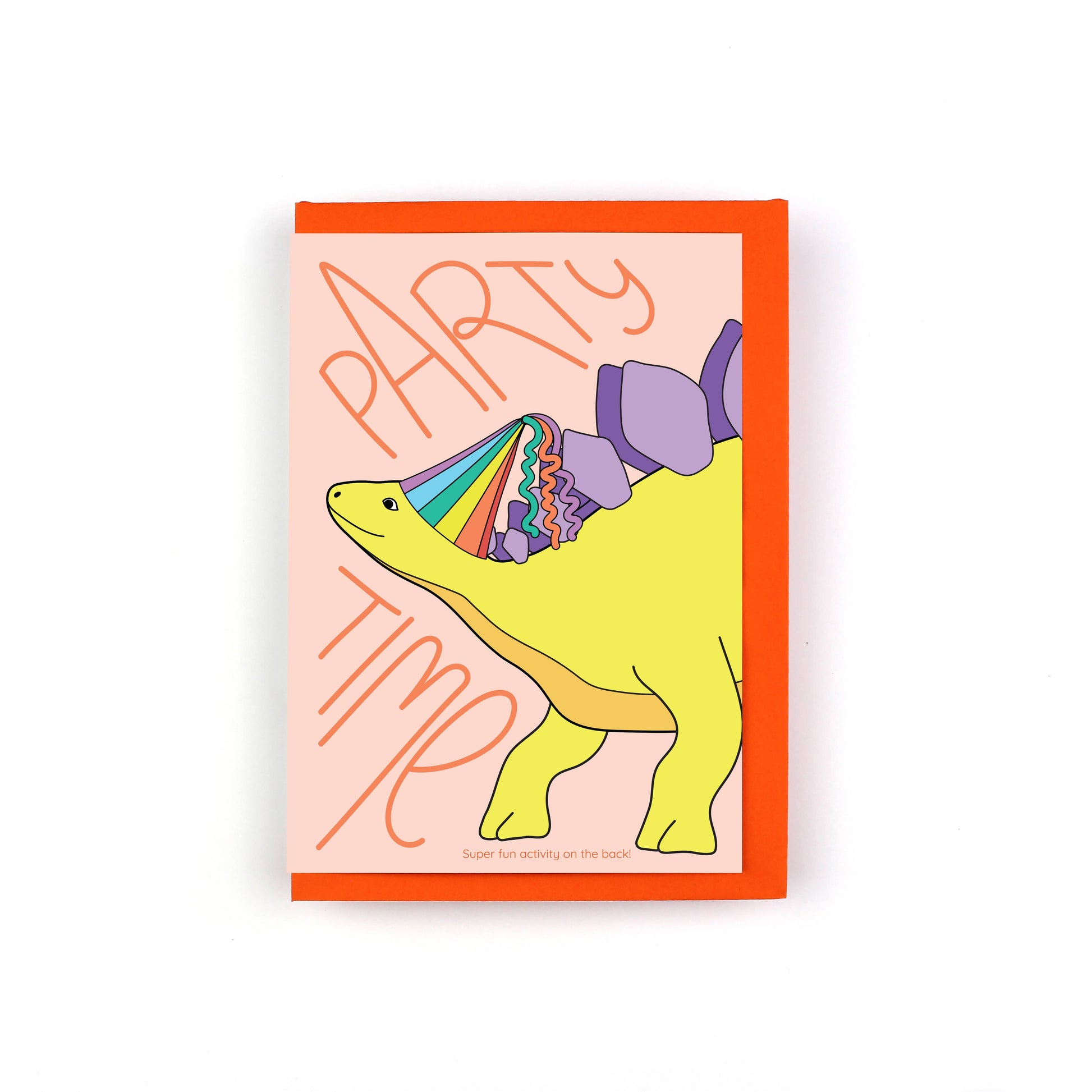 This card features a yellow and purple stegosaurus wearing a party hat. The text around it says 'PARTY TIME'
