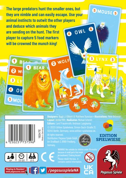 The large predators hunt the smaller ones, but they are nimble and can easily escape. Use your animal instincts to outwit the other players and deduce which animals they are sending on the hunt. The first player to capture 5 food markers will be crowned the munch king!
