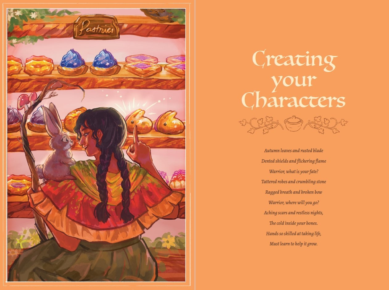 Stewpot is divided into a series of slice-of-life scenes, with a different set of simple rules and prompts helping adjudicate each scene. You might be scrambling to cook something edible with random ingredients, bartending for troubled souls, calming down a tavern brawl, going shopping for all the things a tavern needs, and more! Work to upgrade your tavern’s cuisine, atmosphere, and service. In the process, you might just learn a little bit about yourself – and your fellow party members.