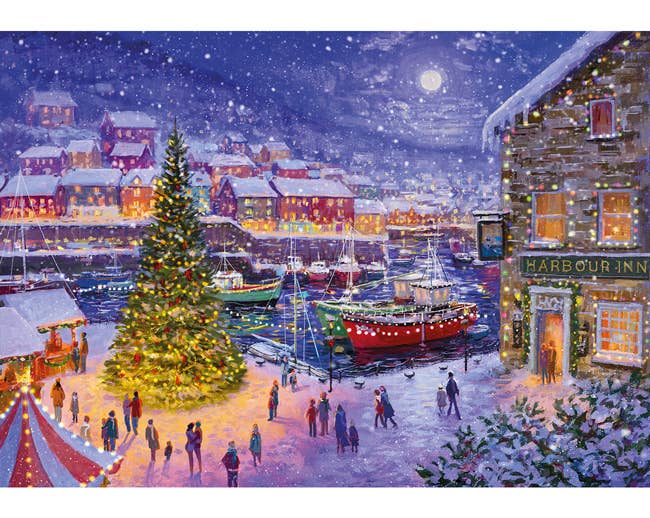 Available in 2 sizes. Embrace the season with this snowy harbour scene. Made using irregularly shaped puzzle pieces and themed whimsies that match this wintry jigsaw puzzle for adults. This premium wooden jigsaw puzzle will be a welcome addition to your festivities this year, providing hours of engaging fun and a satisfying solve down to the very last piece.