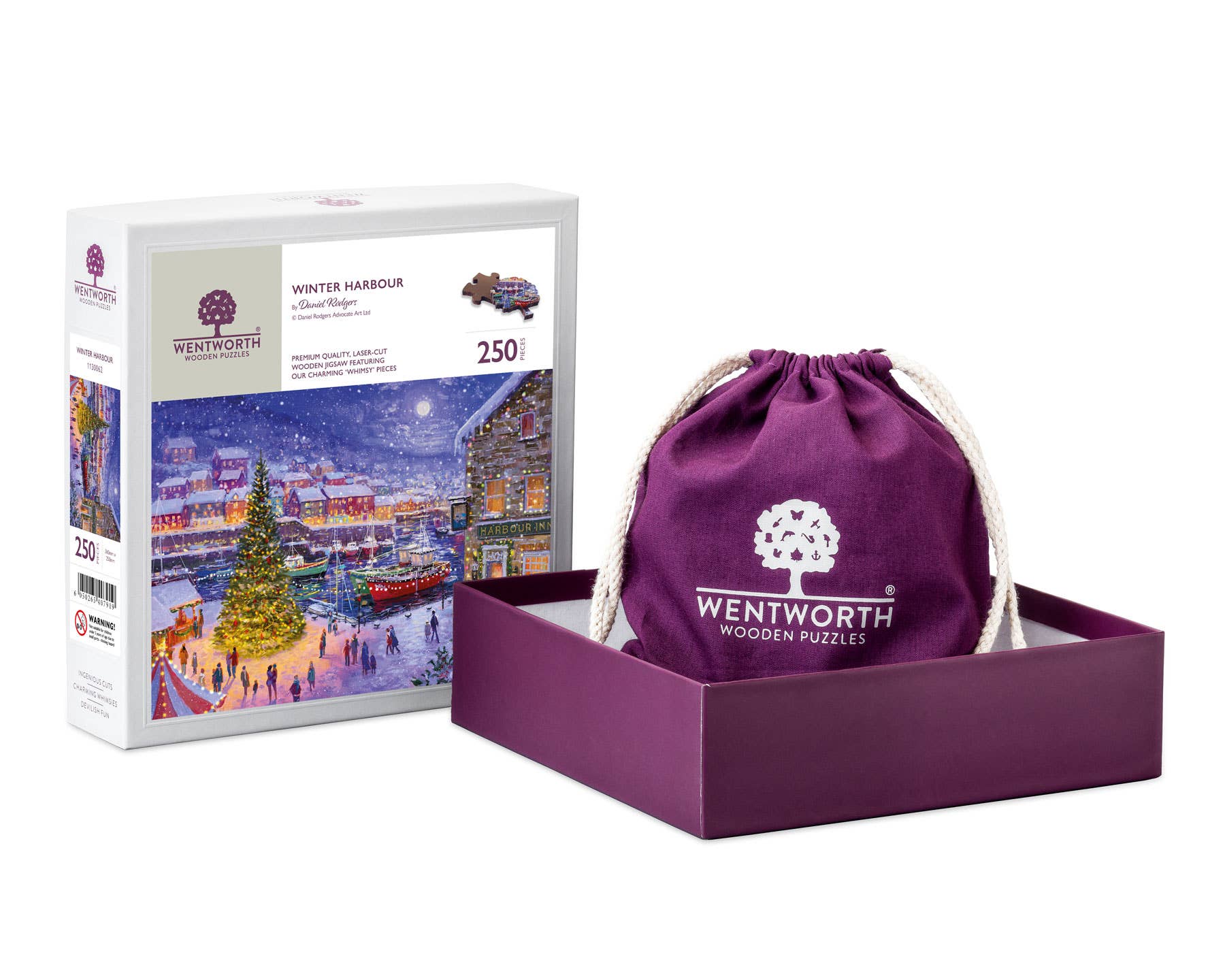 Premium Wooden jigsaw puzzle, in a plum drawstring cloth bag, placed into a plum and grey Wentworth branded box.