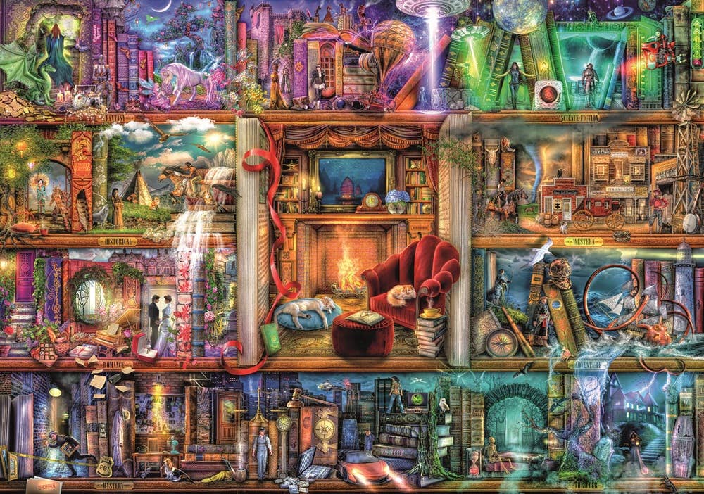 Each puzzle has been individually designed and titled to reflect the theme of the image - ''World Travel Bookshelf', 'The Grand Fiction Library', 'Once Upon A Fairytale' and 'Museum Shelf'.